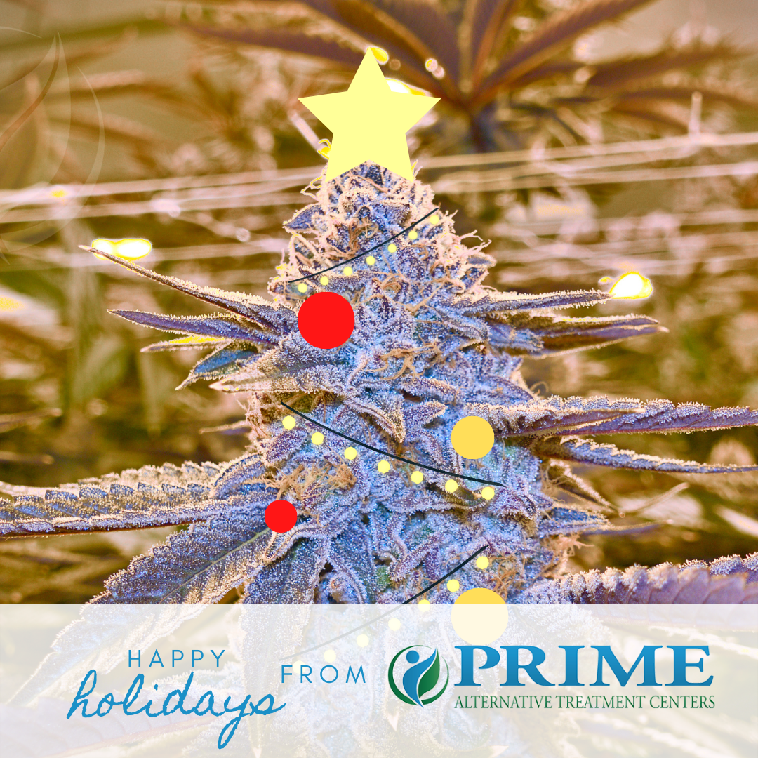 greeting card image of LA Kush Cake plant modified to look like a Christmas tree. Text reads happy holidays from Prime Alternative Treatment Centers